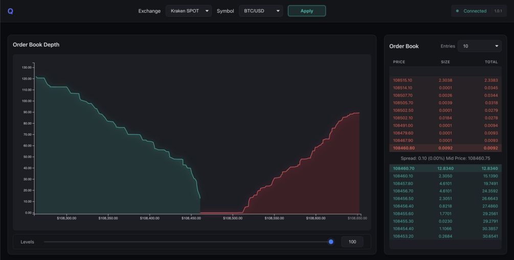 Quantum connects directly to Kraken’s Spot WebSocket and REST APIs, delivering real live market data out of the box.